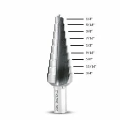 Evolution Premium Step Drills are used to produce a range of hole sizes in steel up to 1/8″ thick using only one tool. The twin flute design allows for a smoother cutting action with no pre-drilling necessary. Evolution Premium Step Drills have 3 chucking flats on the driving shank to ensure no slipping in the chuck.